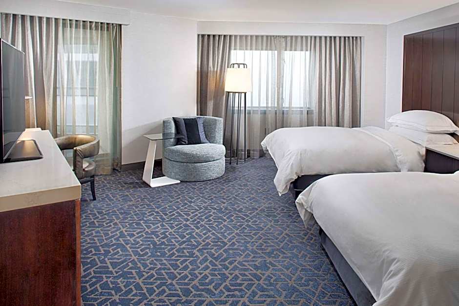 This spacious corner room offers views of downtown Boston.